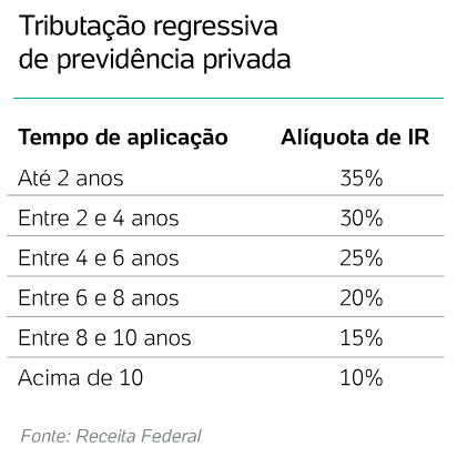 A tabela de IR dos fundos VGBL com tributação regressiva, que são os mais comuns, começa em 35% e diminui cindo pontos porcentuais a cada dois anos. Isso quer dizer que após oito anos, o IR cai para 15%, ficando em linha com outras aplicações de renda fixa. Nesse caso, já compensa investir, mas o ideal seria ficar dez anos, pois o IR cairia para 10%.