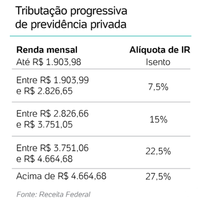 Existem também fundos de previdência com tabela de tributação progressiva. Nesse caso, as alíquotas do IR variam conforme o valor que será resgatado. Essa tabela segue as mesmas alíquotas que são aplicadas no salário (que variam até 27,5%). Quando maior for o resgate, maior será o imposto.